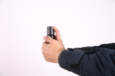 1.双手持握呈戒备姿势。警察侧身戒备站立,用右手将催泪喷射器取出,双手持握罐体,双手向前伸出,手臂伸直,左手臂稍内收发力以增加持握的稳定性,右手手指放置在喷射按钮上,两眼注视目标区,做好喷射的准备。